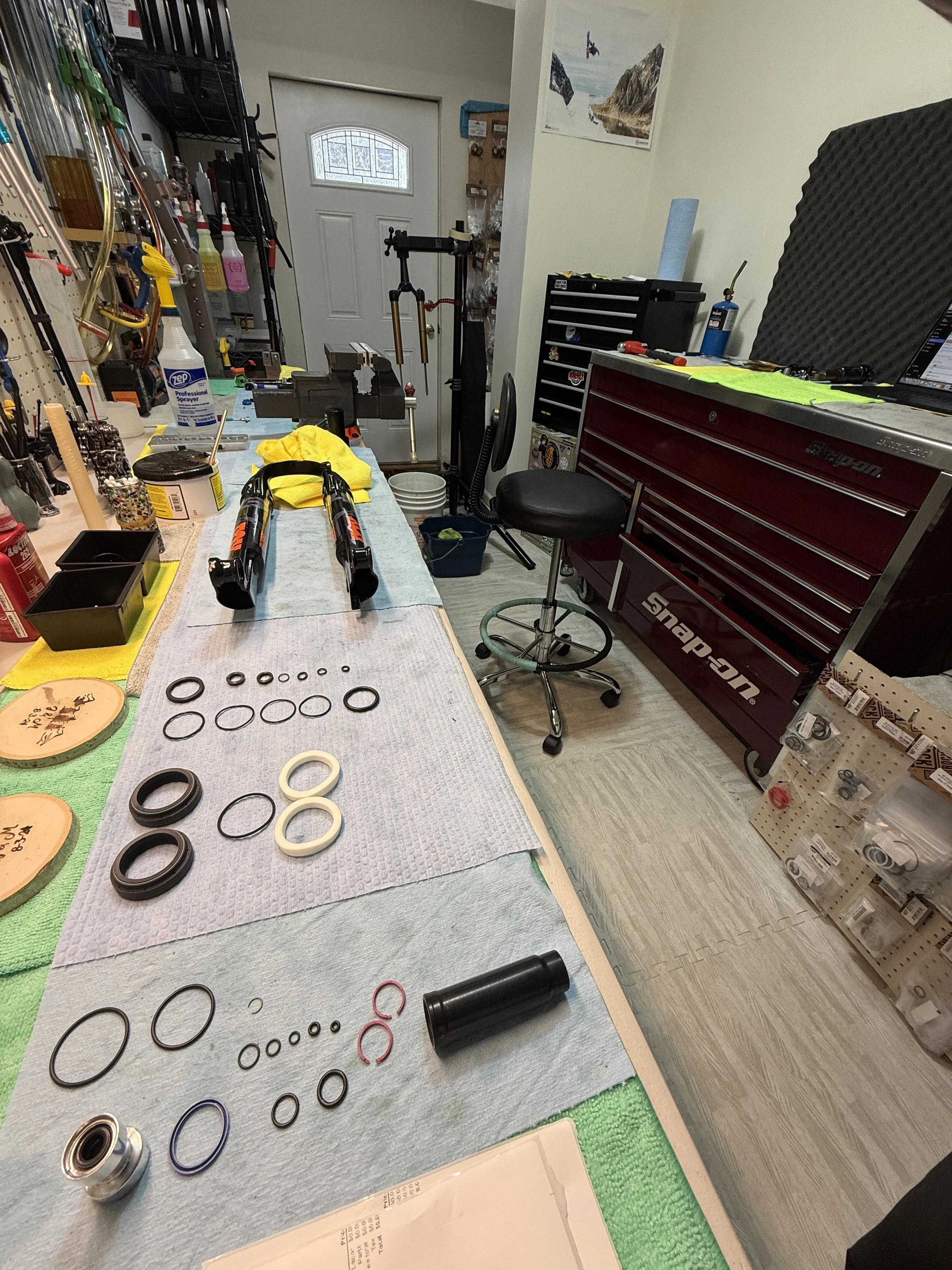 Forks seep oil as part of there normal function, with enough laps on your bike this oil starts to run out! The effect of this can be felt with harsh breakaway, loss of small bump sensitivity and even lockout failure and no rebound control. Have you taken care of your Fork off the trail like it takes care of you on the trail? If not, no worries, we are here to help! A Full fork overhaul takes your suspension fork back to feeling and working like new. New air seals and oil, new damper seals and oil and fresh bath oil and new dust seals will have you fork feeling like new again! Price depends on Fork make and model, typically around $270 parts and labor. Request a quote by letting me know what fork you have. Jimmer@brassbellbikes.com
